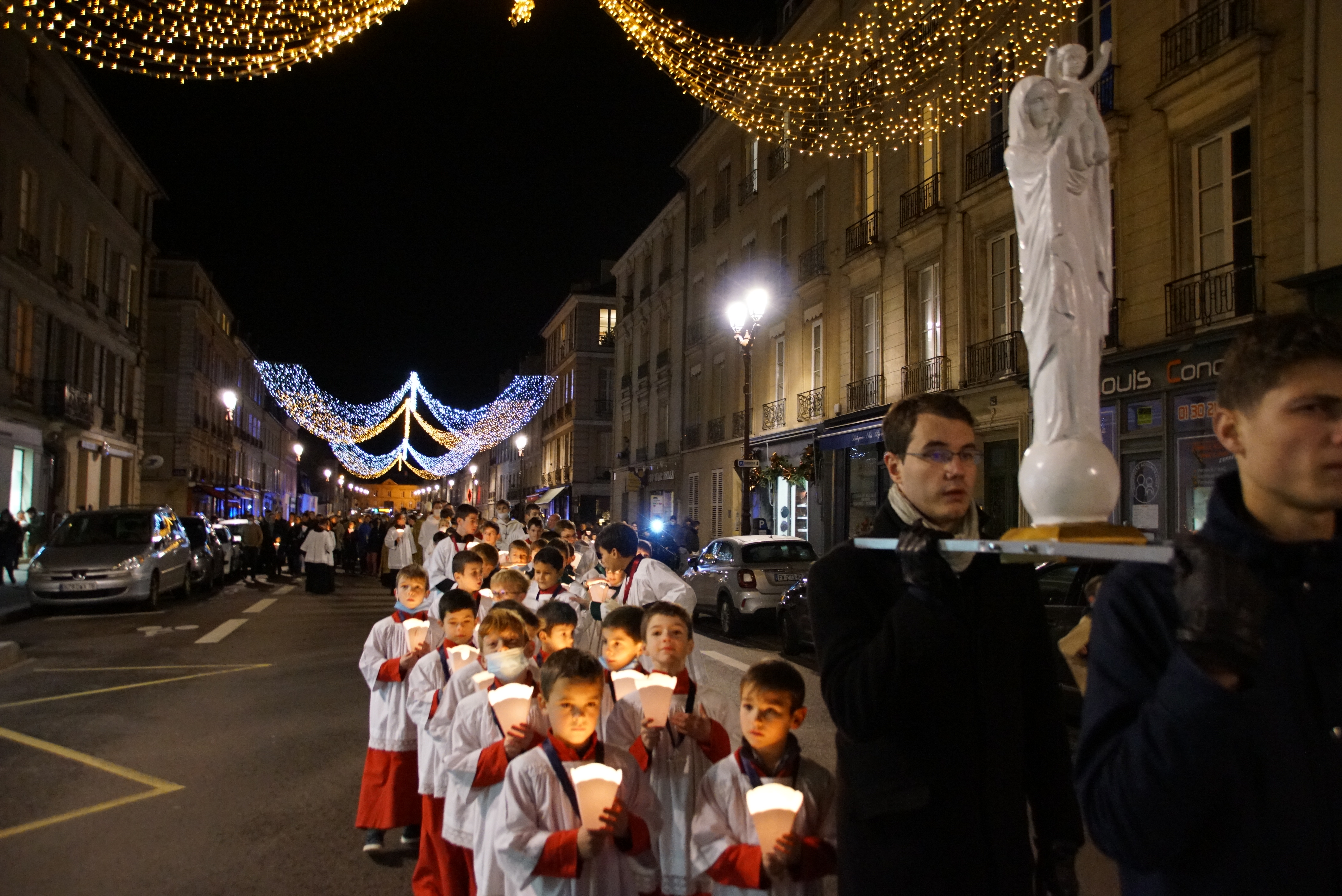 Pour honorer la Sainte Vierge Marie, en ce 8 décembre, fête de son Immaculée Conception, après les Vêpres chantées à la chapelle de l’Immaculée, la procession s’est élancée dans les rues de Versailles pour rejoindre la cathédrale Saint Louis, avec la présence de Mgr Valentin et de nombreux fidèles de paroisses de Versailles, pour une veillée de prières et une adoration du Saint Sacrement.