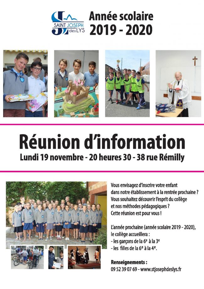 Vous devez inscrire votre enfant au collège l’année prochaine? Vous voulez vous renseigner sur les méthodes pédagogiques et l’esprit du collège de St Joseph des Lys? en 2019 le collège accueillera les garçons, de la 6° à la 3°et les filles de la 6° à la 4° Réunion d’information le 19 novembre 2018, à 20h30,…