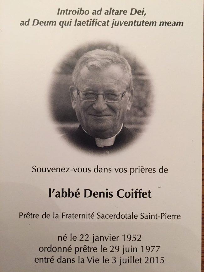 Communiqué de la Maison générale de la Fraternité Saint-Pierre : Merci de prier pour le repos de l’âme de l’abbé Denis Coiffet FSSP. Notre confrère a rendu paisiblement son âme à Dieu ce matin vers 4h50, en la fête de saint Irénée de Lyon, entouré des siens et accompagné des prières de l’Église. L’abbé Vianney Le…