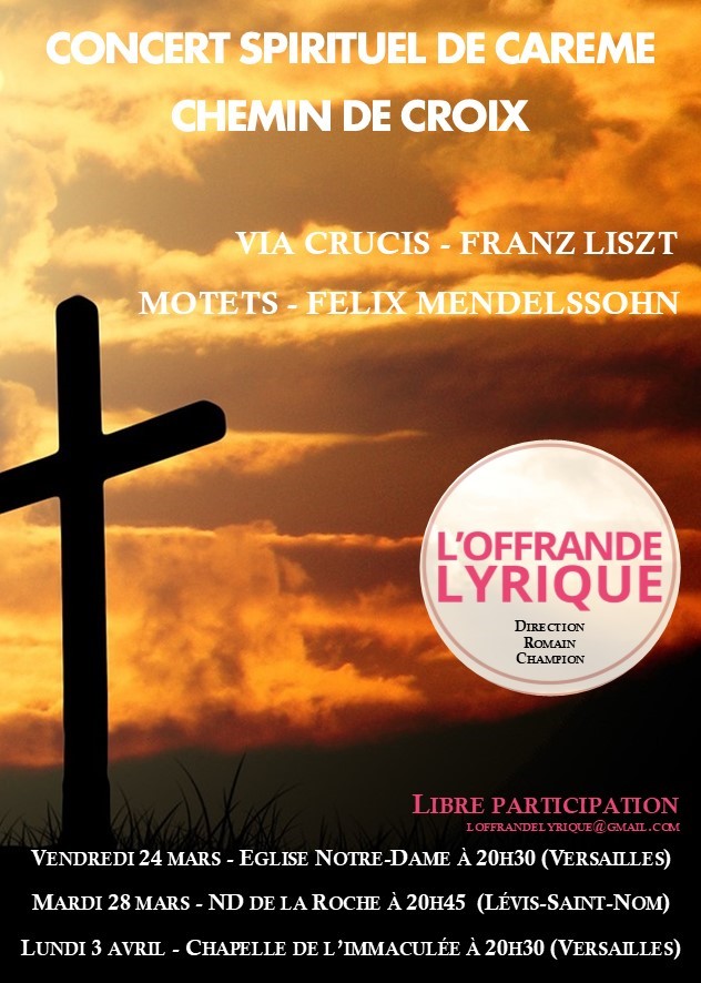 En raison d’un concert de l’Offrande Lyrique qui aura lieu lundi à l’Immaculée, le cours de catéchisme pour adultes est reporté au lundi 17 avril à 20h45.