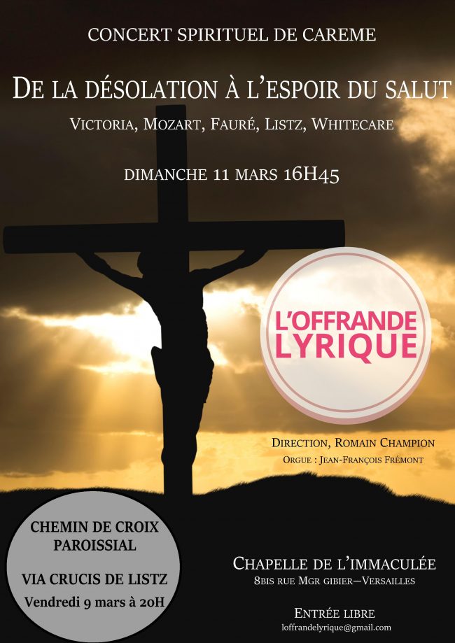 Un carême en musique… Concerts spirituels de Carême à 17h les dimanches : Dimanche 18 février par les Petits Chanteurs du Carmel de Fontainebleau Dimanche 4 mars par le chœur de jeunes de Rogatien Despaigne Dimanche 11 mars à 16h45 par l’Offrande Lyrique ____ Chemin de Croix avec la Via Crucis de Litz…